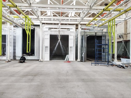 Оборудование линии: камера моечная с внутренними габаритами 13000х4000х4000 мм, камера дробеструйной очистки 13000х4000х4000 мм, камера полимеризации 12000х3000х4000 мм, окрасочная камера 13000х4000х4000 мм, ручная монорельсовая транспортная система.
